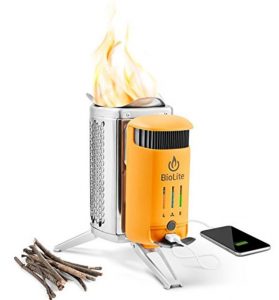 This is truly an amazing camping gadget. The Biolite Wood Burning Camp Stove is a full service stove, battery charger, kettle, and light. The device captures heat from the internal fire and converts it to electricity to power and charge your gadgets and the included LED light.